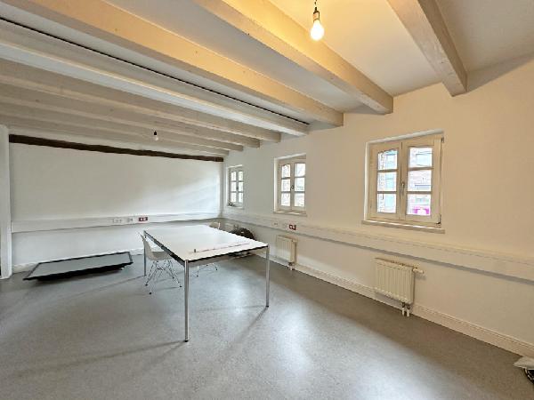 Das Erdgeschoss bietet einen offenen Eingangsbereich, drei große Räume, einen Wintergarten und eine Küche. Eine offene Stahltreppe führt ins Ober- und Dachgeschoss. Das Obergeschoß verfügt über vier großzügige Räume, wobei ein Zimmer ein Durchgangszimmer ist. Ein fünfter Raum bietet sich als Kopierraum an. Weiterhin sind auf dieser Etage zwei separate Toiletten für Damen und Herren vorhanden. Im Dachgeschoss befinden sich zwei miteinander verbundene Räume. Das Untergeschoss bietet mit seinem alten Kellergewölbe viel Stauraum, zwei separate Toiletten und einen direkten Zugang zur Tiefgarage. Hier befinden sich 7 TG-Stellplätze, die ebenfalls erworben werden können.